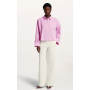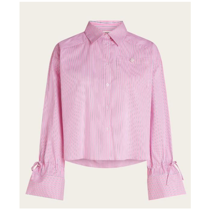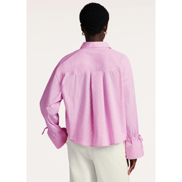 Blúzka je ružová s úzkymi zvislými prúžkami (kombinácia ružovej a bielej), čo jej dodáva čistý a moderný vzhľad. Má klasický golier a zapínanie na gombíky po celej dĺžke vpredu. Strih je mierne voľnejší a skrátený (cropped), takže končí približne v oblasti pásu.