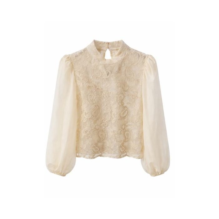 Predná časť je zdobená čipkou s bohatým, mierne plastickým vzorom, ktorý vytvára luxusný dojem. Rukávy sú dlhé, mierne nariasené a z ľahkého, priesvitného materiálu, čo kontrastuje s hustejšou čipkou na tele blúzky. Na koncoch rukávov sú jemne stiahnuté.