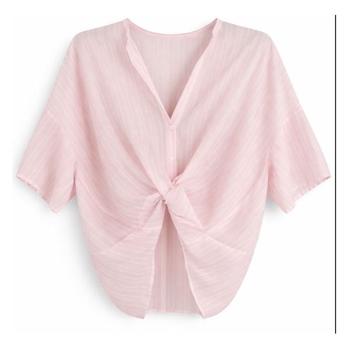 Jemná svetloružová blúzka s decentným prúžkovaným vzorom pôsobí vzdušne a veľmi žensky. Má voľnejší strih, krátke rukávy a hlbší výstrih do „V“, ktorý je doplnený viazaním vpredu- môžeš ju nosiť z viazaním alebo aj bez-zapravenú. Ľahký, mierne priesvitný materiál z nej robí ideálny kúsok na teplejšie dni.