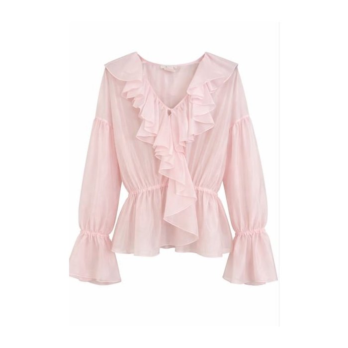 Je vyrobená z ľahkého, vzdušného materiálu, vďaka čomu pôsobí veľmi nežne a pohodlne na nosenie. Dominantným prvkom je výstrih do V zdobený kaskádovými volánmi, ktoré dodávajú blúzke luxusný a ženský vzhľad. V páse je jemne stiahnutá elastickým riasením, čo krásne zvýrazní siluetu.