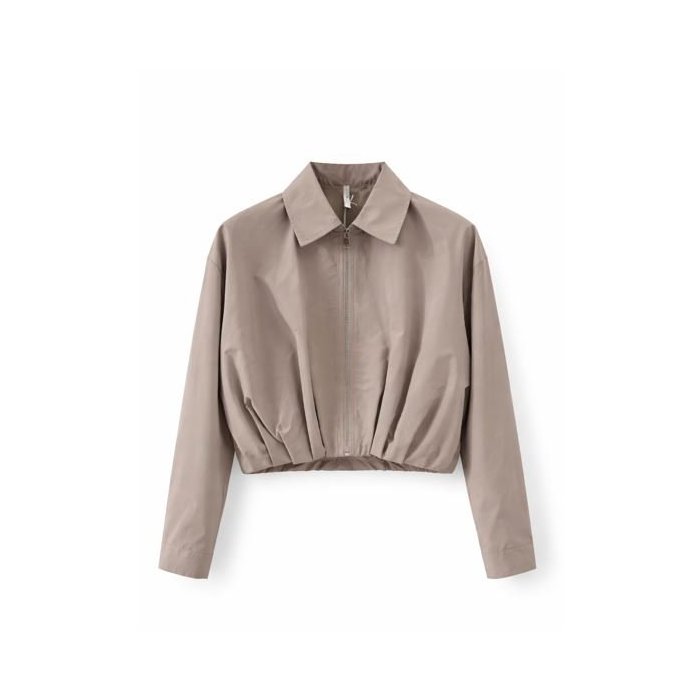 Táto krátka dámska bunda v jemnom béžovo-taupe odtieni predstavuje moderný minimalistický kúsok ideálny na prechodné obdobie. Má klasický košeľový golier a zapínanie na zips tón v tóne, ktoré pôsobí čisto a elegantne. Dlhé rukávy sú zakončené jednoducho, bez rušivých detailov, zatiaľ čo jemne riasený spodný lem vytvára mierne balónový efekt a dodáva siluete ženskosť.