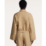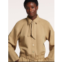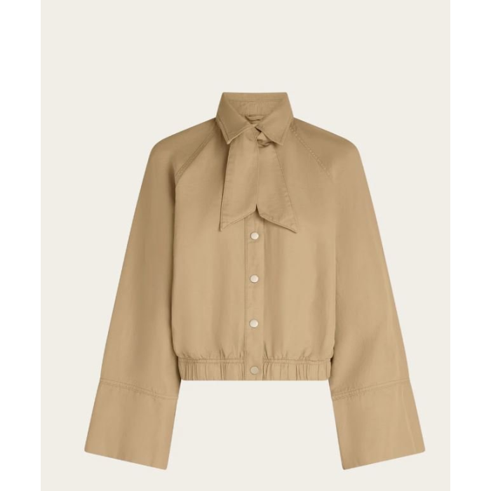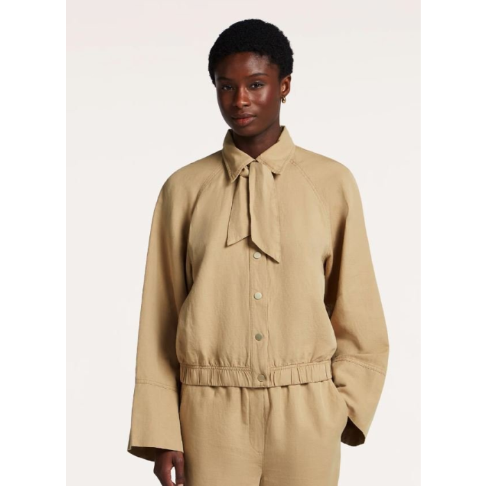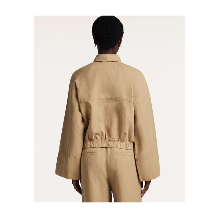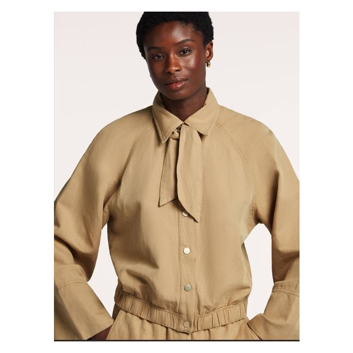 Dominantným prvkom je jemne štruktúrovaný materiál – kombinácia organickej bavlny a ľanu zaručuje priedušnosť a komfort aj počas teplejších dní. Bunda je príjemná na dotyk, ľahká a ideálna na vrstvenie v lete.