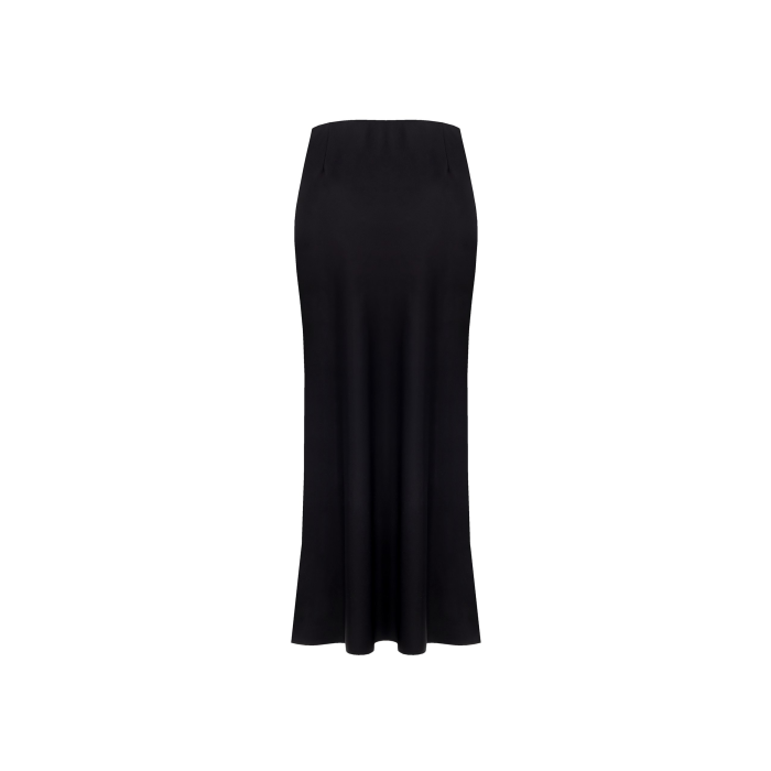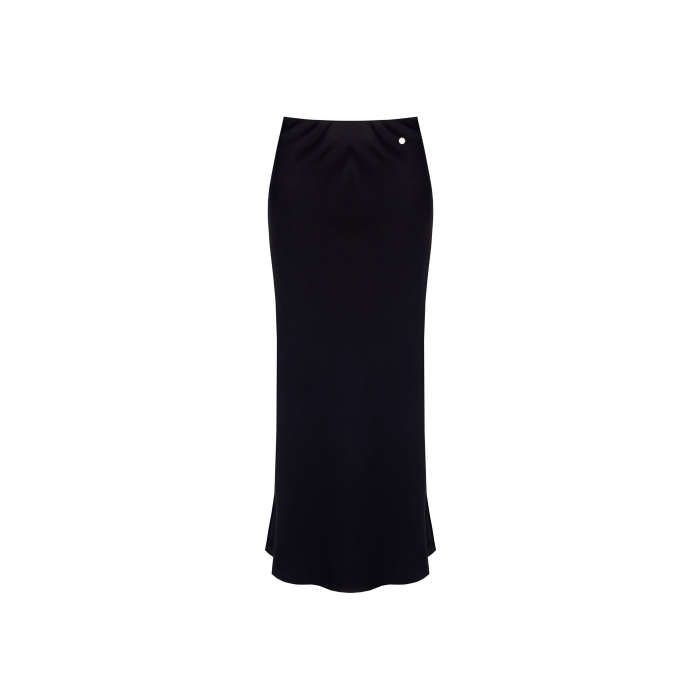 Sukňa je vyrobená z hladkého materiálu a má mierne rozšírený spodný lem, čo jej dodáva sofistikovaný a splývavý vzhľad. Na hornej časti vpravo je malý ozdobný detail – kovový gombík alebo logo. Tento kúsok je univerzálny a vhodný na formálne aj elegantné príležitosti.