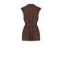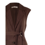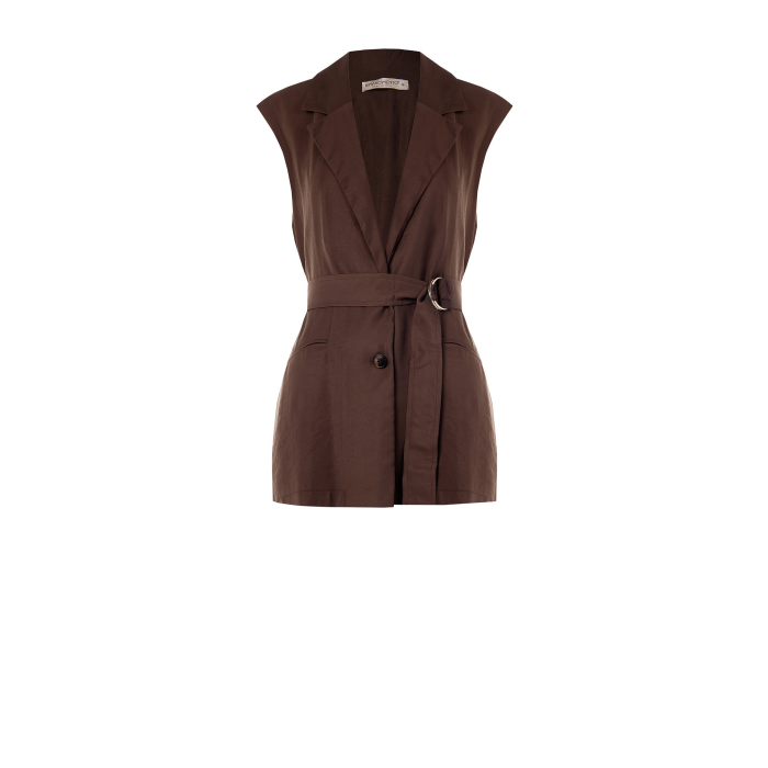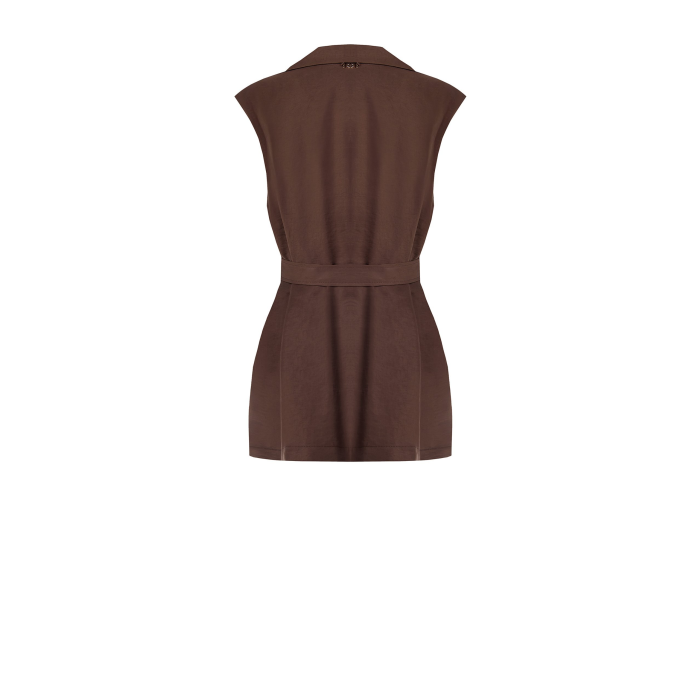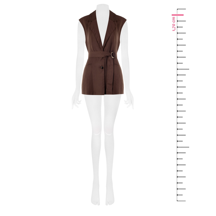 Vesta má klasické zapínanie na gombíky a jemné vypchávky na ramenách, ktoré jej dodávajú elegantný vzhľad. Súčasťou je aj opasok s kovovou prackou, vďaka ktorému si ju môžete prispôsobiť presne podľa svojich predstáv.