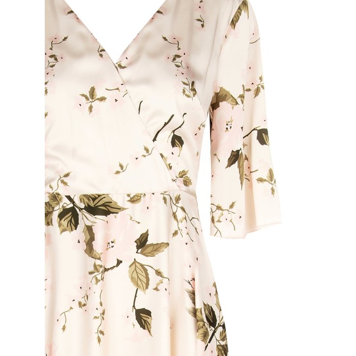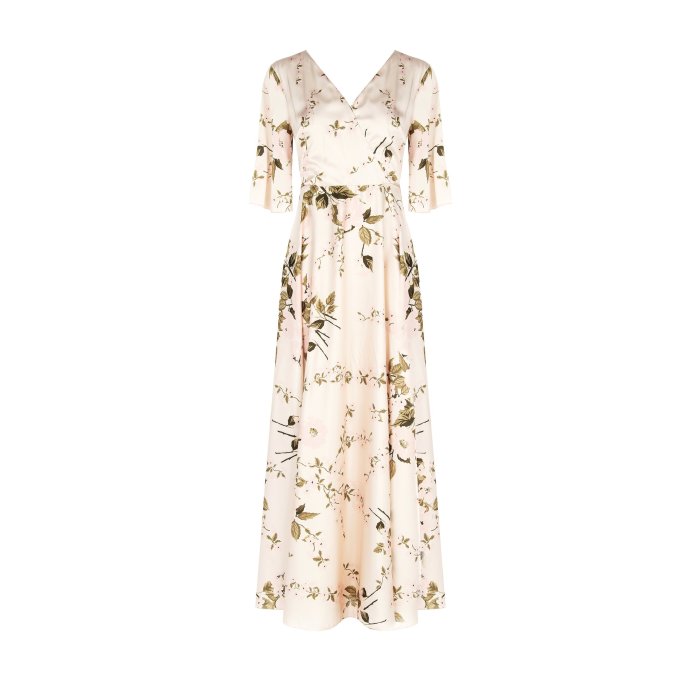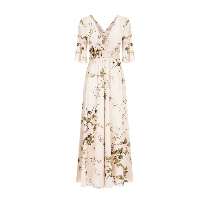 Ide o elegantné maxi šaty s jemným kvetinovým vzorom na svetlom pozadí. Majú zavinovací výstrih do V, ktorý pôsobí sofistikovane a lichotí postave. Rukávy sú trojštvrťovej dĺžky, čo dodáva šatám jemný a romantický vzhľad. Pás je zvýraznený, čím vytvára ženskú siluetu, a sukňa je splývavá s jemným rozšírením smerom dole. Celkový dizajn je elegantný a vhodný na rôzne formálne alebo slávnostné príležitosti.