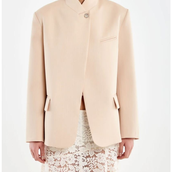 Sako pôsobí veľmi minimalistické, ale za to veľmi moderné. Má svetlý béžový (telový) odtieň, ktorý je univerzálny a ľahko kombinovateľný.