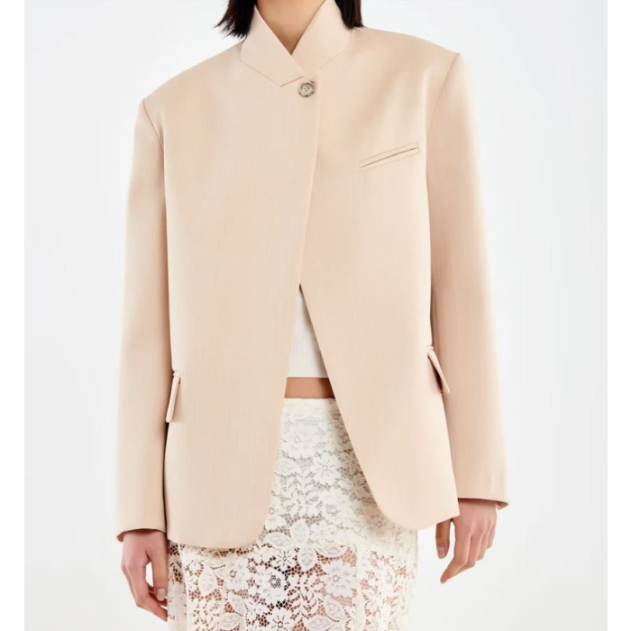 Strih je rovný a mierne voľnejší, čo dodáva outfitu sofistikovaný vzhľad. Predná časť je riešená netradične – sako sa nezapína klasicky v strede, ale má asymetrické preloženie s jedným viditeľným gombíkom pri krku. Vďaka tomu pôsobí veľmi čisto a dizajnovo.