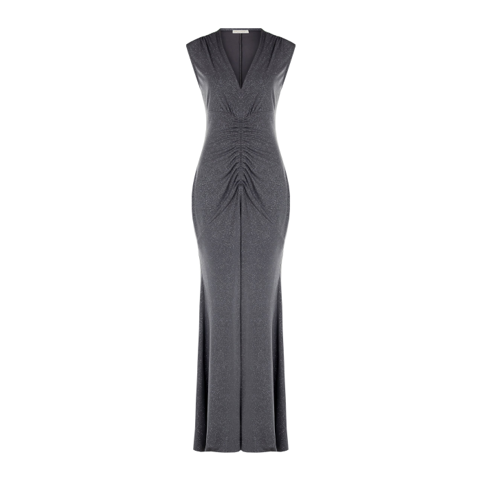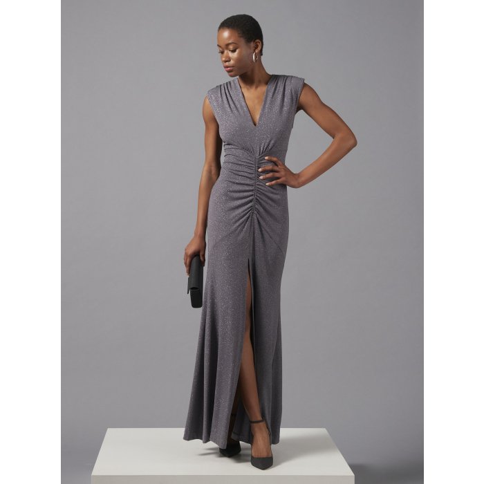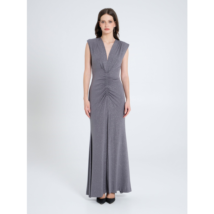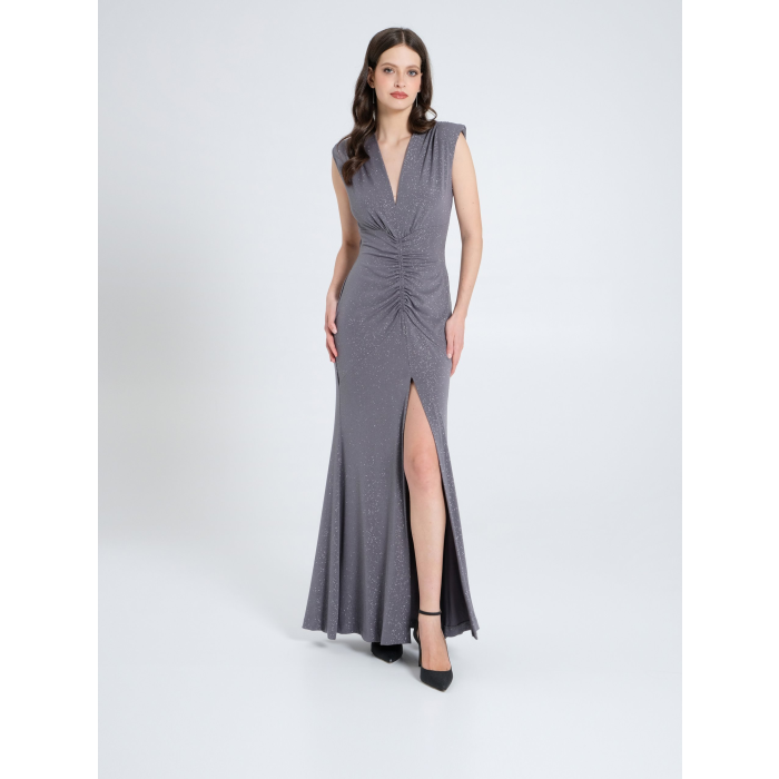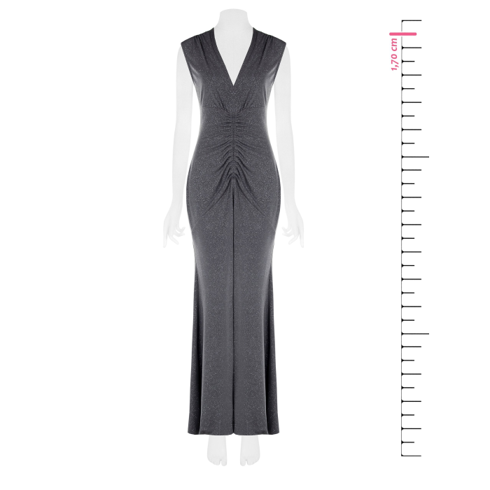 Predstavujeme vám nádherné ženské šaty s trblietavým efektom, ktoré vás určite dostanú do centra pozornosti na akýchkoľvek formálnych udalostiach, ako sú svadby, plesy alebo stužkové slávnosti. Šaty majú elegantný výstrih do tvaru V a sú zúžené v páse rafinovaným riasením, ktoré efektívne zakrýva neželané tukové vankúšiky na brušku.