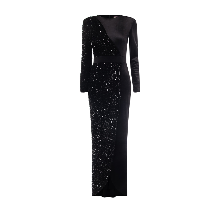 Tieto šaty sú elegantného štýlu a sú vyhotovené v čiernej farbe. Majú asymetrický dizajn s kombináciou materiálov - jedna časť je pokrytá flitrami, ktoré dodávajú šatám lesk a luxusný vzhľad, zatiaľ čo druhá časť je z hladkého, matného materiálu.