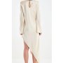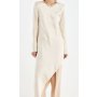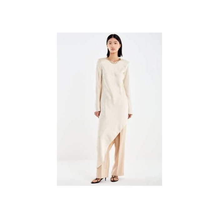 Ide o dlhé maxi šaty v jemnej béžovej až krémovej farbe, ktoré pôsobia luxusne, čisto a veľmi elegantne. Majú rovný, mierne priliehavý strih, ktorý krásne kopíruje siluetu, a siahajú až po zem, pričom sú zakončené jemným asymetrickým detailom s rozparkom. Dlhé, jednoduché rukávy dodávajú šatám sofistikovaný vzhľad a okrúhly, čistý výstrih bez zbytočných detailov podčiarkuje ich minimalistický charakter.