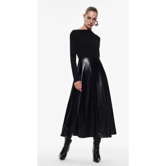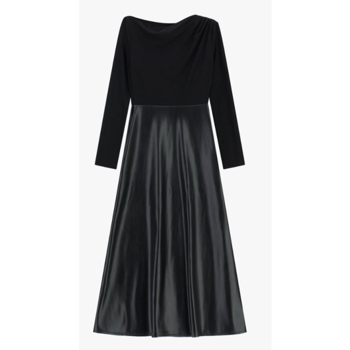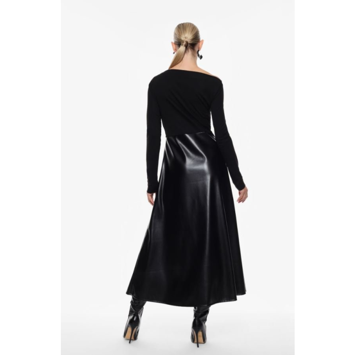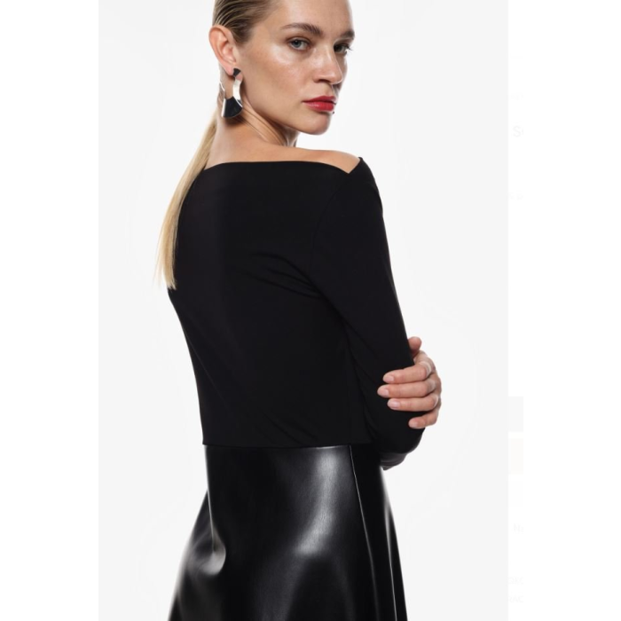 Horná časť šiat je z elastického materiálu s dlhými rukávmi a jemným nariasením pri dekolte, ktorý má mierne asymetrický výstrih. Spodná časť šiat je z lesklého čierneho materiálu z umelej kože, a má áčkový strih – rozširuje sa smerom nadol. Šaty sa prevliekajú cez hlavu. Sú vhodné na bežné udalosti, ale aj na spoločenské a formálne príležitosti. Príjemný materiál z viskózy zaručí pohodlné nosenie počas celého dňa.