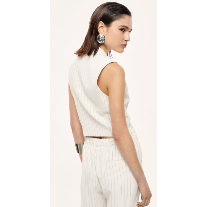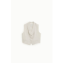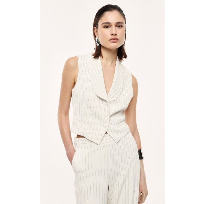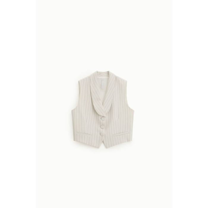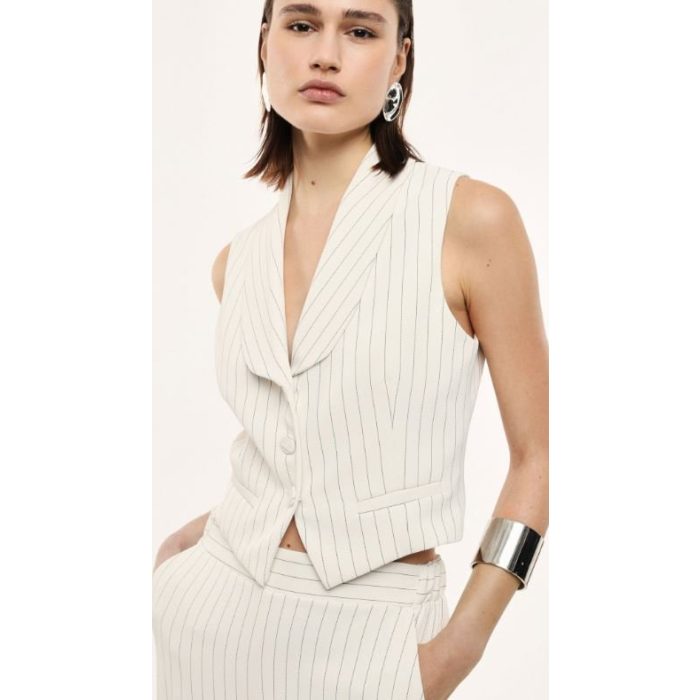 Vesta je bez rukávov, s hlbším véčkovým výstrihom a zapínaním na gombíky vpredu. Strih je mierne priliehavý v páse, takže pekne zvýrazňuje siluetu, a spodný okraj je jemne do špičky, čo jej dodáva taký sako-vý charakter.