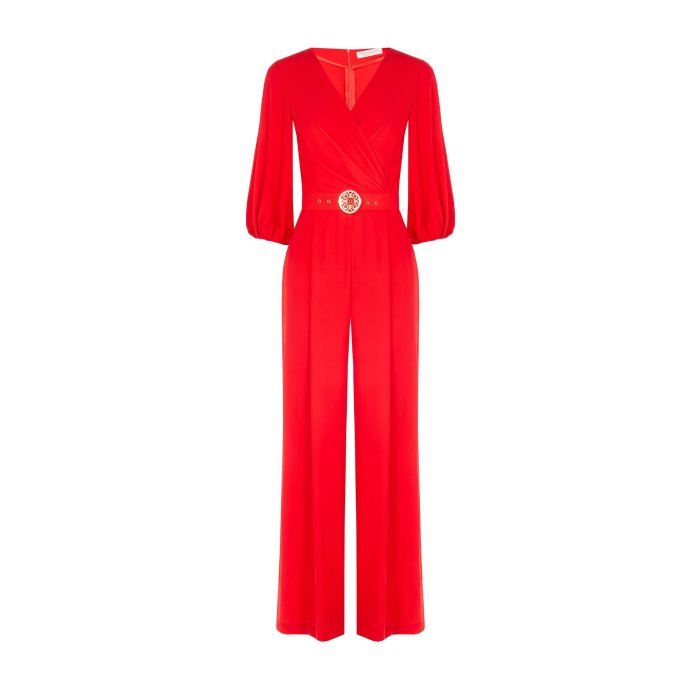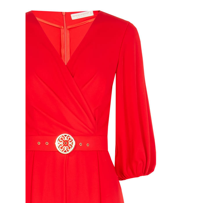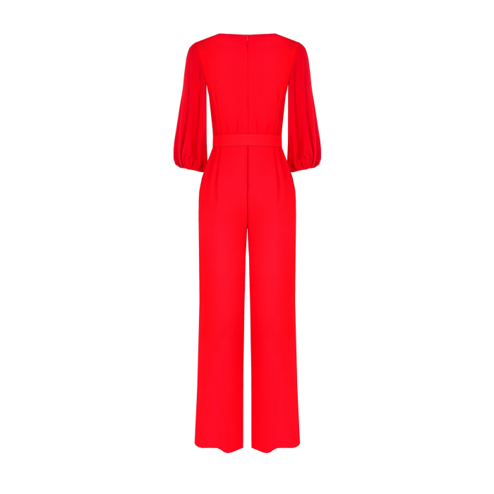 Overal má zavinovací výstrih do V, ktorý vytvára sofistikovaný vzhľad. Rukávy sú nadýchané a majú elastické manžety, čo dodáva outfitu jemnosť a ženskosť. V páse je zvýraznený opaskom so zdobenou kruhovou sponou, ktorý pomáha definovať siluetu. Materiál pôsobí ľahko a splývavo, vhodný na formálne alebo spoločenské príležitosti.
