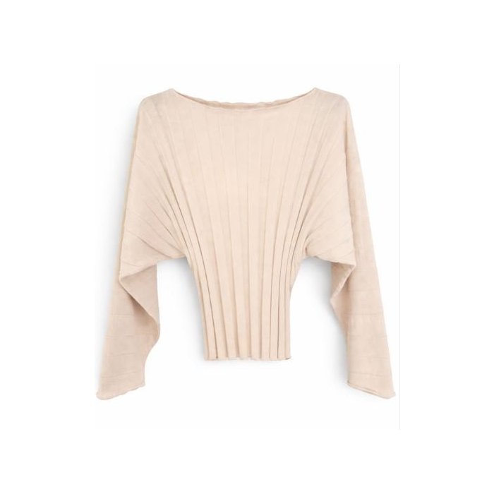 Elegantný béžový top z jemného úpletu zaujme svojím minimalistickým, no zároveň sofistikovaným dizajnom. Má voľnejší strih s netopierími rukávmi, ktoré sa smerom k zápästiu zužujú, čím vytvárajú zaujímavú siluetu. Vertikálne rebrovanie opticky predlžuje postavu a dodáva materiálu štruktúru.