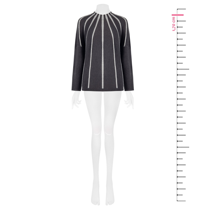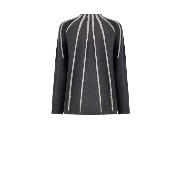 Dámsky teplý sveter s výrazným vertikálnym pruhovaným detailom, ktorý zaujme na prvý pohľad. Pruhy sú zdobené všitými flitrami, ktoré dodávajú modelu luxusný šmrnc a jemný lesk. Sveter je vyrobený z mimoriadne jemného a príjemného materiálu, ktorý zaručuje pohodlie počas nosenia. Ideálny na chladné dni, keď chcete spojiť štýl s praktickosťou.