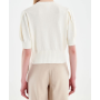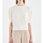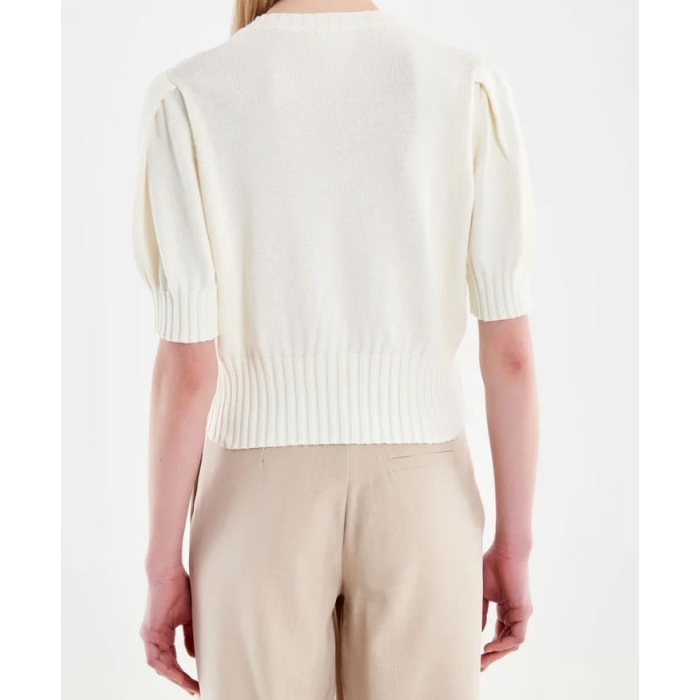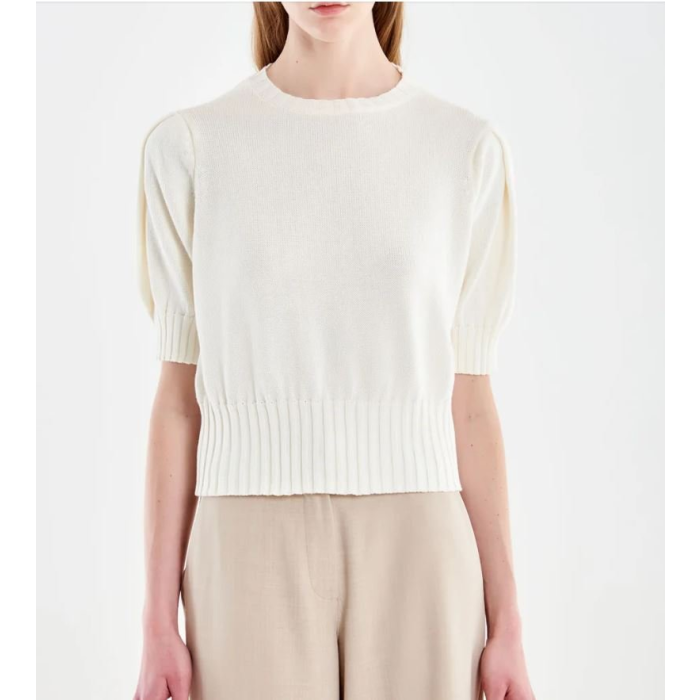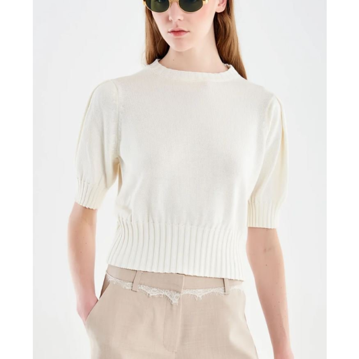 Elegantný dámsky sveter v jemnej pastelovej farbe z príjemného, ľahkého úpletu. Má klasický okrúhly výstrih a krátke, mierne naberané rukávy zakončené rebrovaným lemom, ktorý dodáva modelu štruktúru a štýl. Spodná časť svetra je taktiež ukončená širším rebrovaným pásom, ktorý pekne zvýrazní siluetu.Sveter pôsobí minimalisticky, no zároveň veľmi žensky – ideálny na každodenné nosenie aj elegantnejšie kombinácie.
