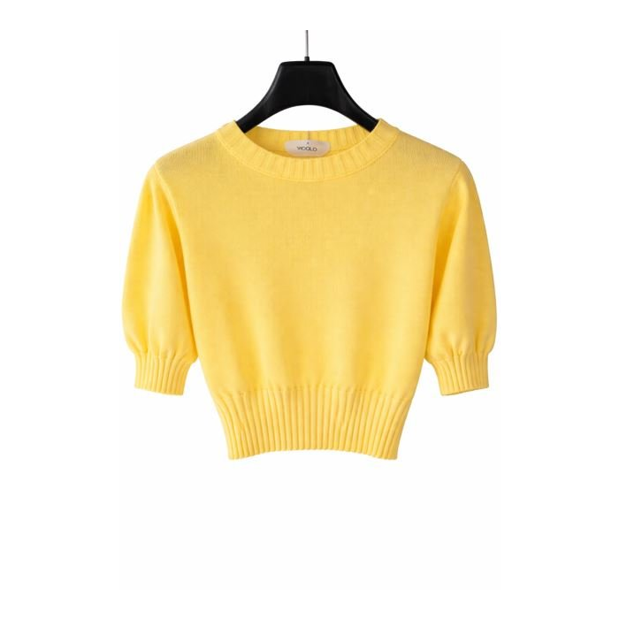 Elegantný dámsky sveter v jemnej pastelovej žltej farbe z príjemného, ľahkého úpletu. Má klasický okrúhly výstrih a krátke, mierne naberané rukávy zakončené rebrovaným lemom, ktorý dodáva modelu štruktúru a štýl. Spodná časť svetra je taktiež ukončená širším rebrovaným pásom, ktorý pekne zvýrazní siluetu.Sveter pôsobí minimalisticky, no zároveň veľmi žensky – ideálny na každodenné nosenie aj elegantnejšie kombinácie.
