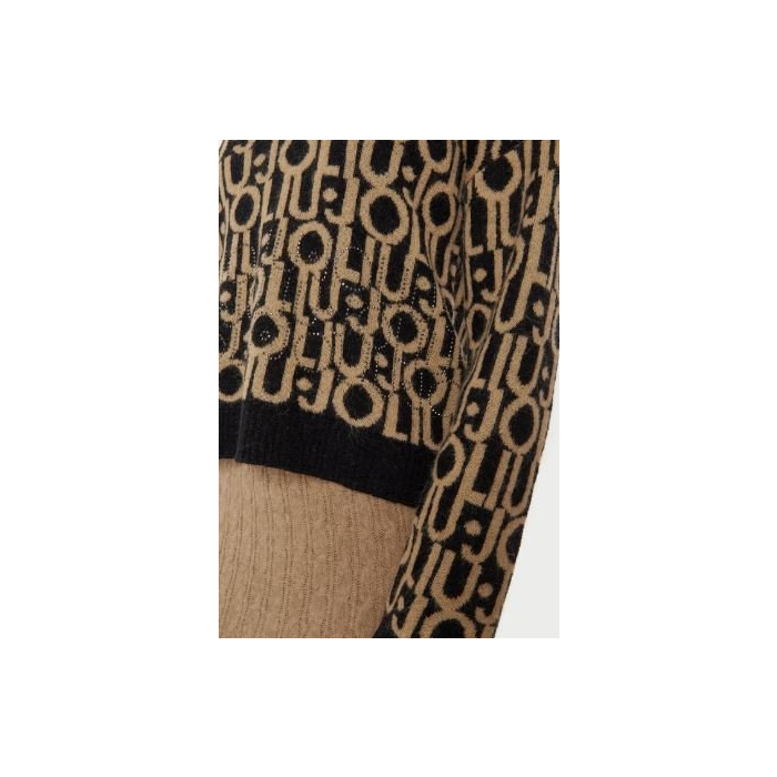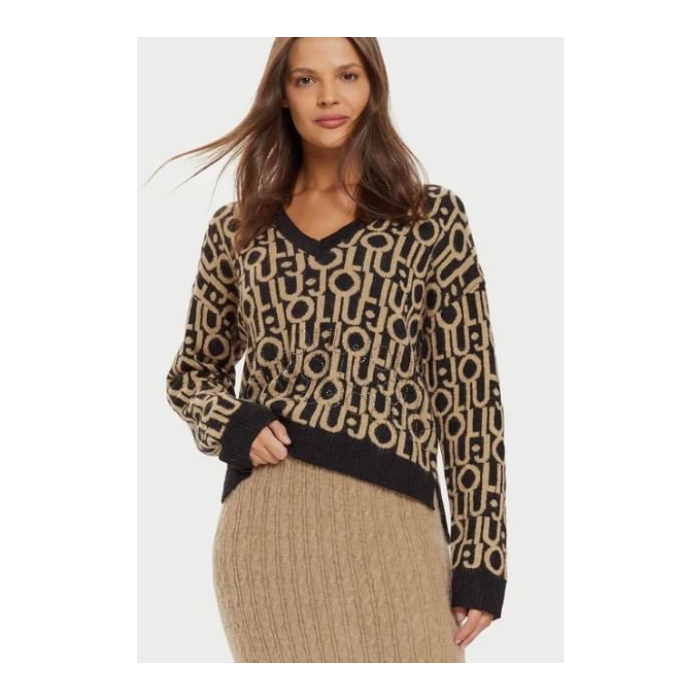 Vlnený sveter je ideálnym spoločníkom počas chladných zimných dní. Tento model kombinuje vlnu a alpakovú priadzu, vďaka čomu vás aj v tých najchladnejších mesiacoch zahreje a zároveň vám poskytne maximálny komfort. Celá plocha svetra je zdobená logom značky, ktoré pridáva na exkluzívnosti. V spodnej časti svetra sú pevne pripevnené drobné kamienky, ktoré na svetle jemne odrážajú svetlo, vytvárajúc tak elegantný efekt a zvýrazňujú logo značky LiuJo.